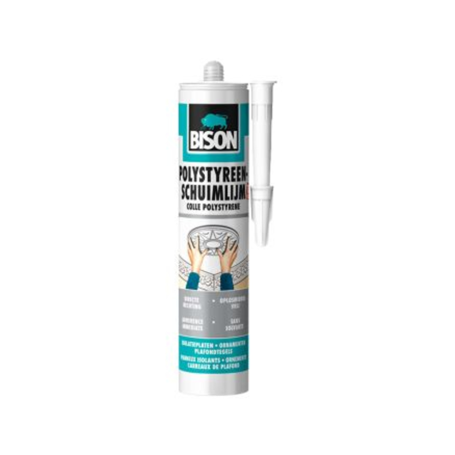 Polystyreenschuimlijm voor isolatieplaten en -folie, decoratieplaten, plafondtegels, tevens voor wandbekleding met vinyl en PVC-rug.